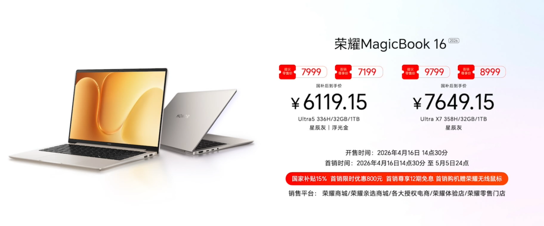 荣耀 MagicBook 16 2026:Ultra5 336H/32GB/1TB,首销 7199 元,国补后 6119.15 元;Ultra X7 358H/32GB/1TB,首销 8999 元,国补后 7649.15 元;