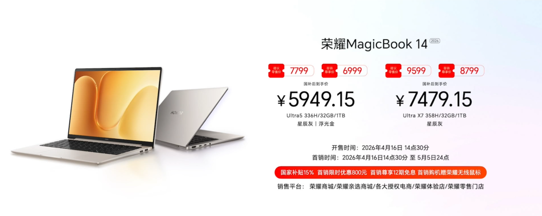 荣耀 MagicBook 14 2026:Ultra5 336H/32GB/1TB,首销 6999 元,国补后 5949.15 元;Ultra X7 358H/32GB/1TB,首销 8799 元,国补后 7479.15 元;