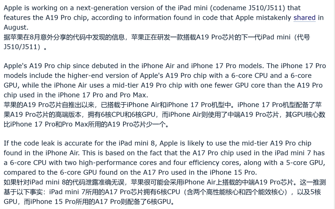 MacRumors 爆料,iPad mini 8 代号 J510/J511,预计今年下半年发布,将搭载 A19 Pro 芯片,iPhone Air 同款,不是满血版。