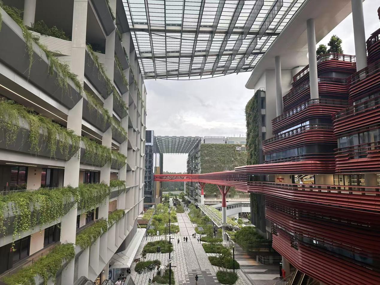 在硅谷的产业构成中,诸如斯坦福等高校的存在必不可少。毗邻榜鹅园区的,则是新加坡第五所公立大学——新加坡理工大学 (Singapore Institute of Technology) 的校园,为了让产、学合作更紧密,在园区设计上,也通过廊道互通的方式,将榜鹅园区与新加坡理工大学二者“无缝”连接起来。